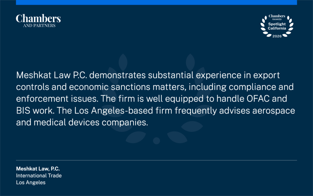 Based in Los Angeles, Meshkat Law represents clients across the United States and around the world in U.S. sanctions, export controls, and related national security matters.